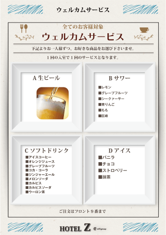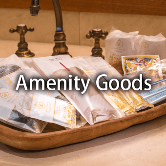 シャンプー類・歯ブラシ・かみそり・くしなどの基本グッズは標準完備。ミネラルウォーターやティーセットなど、全て無料でご利用頂けます。充実のアメニティをご用意しました。
