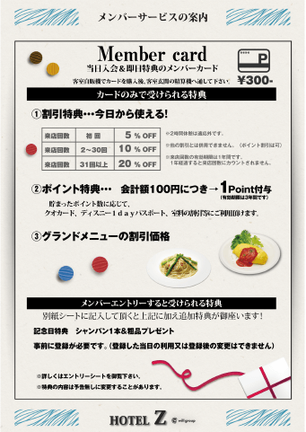 メンバーズカードは客室の自販機で300円で販売しております。初回より5%、来店回数によって20%までの室料割引があります。2時間休憩は適用外。また、ポイント景品交換やグランドメニューをメンバー価格でご利用頂けます。